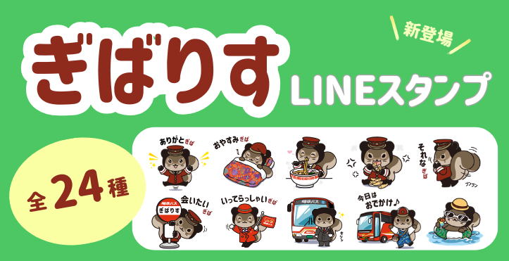 スタンプは日常会話や季節のイベント時に使える、岐阜愛と岐阜バス愛に溢れた全24種類。ぎばりすが着用する制服や、モケット柄の小物にも注目です!
