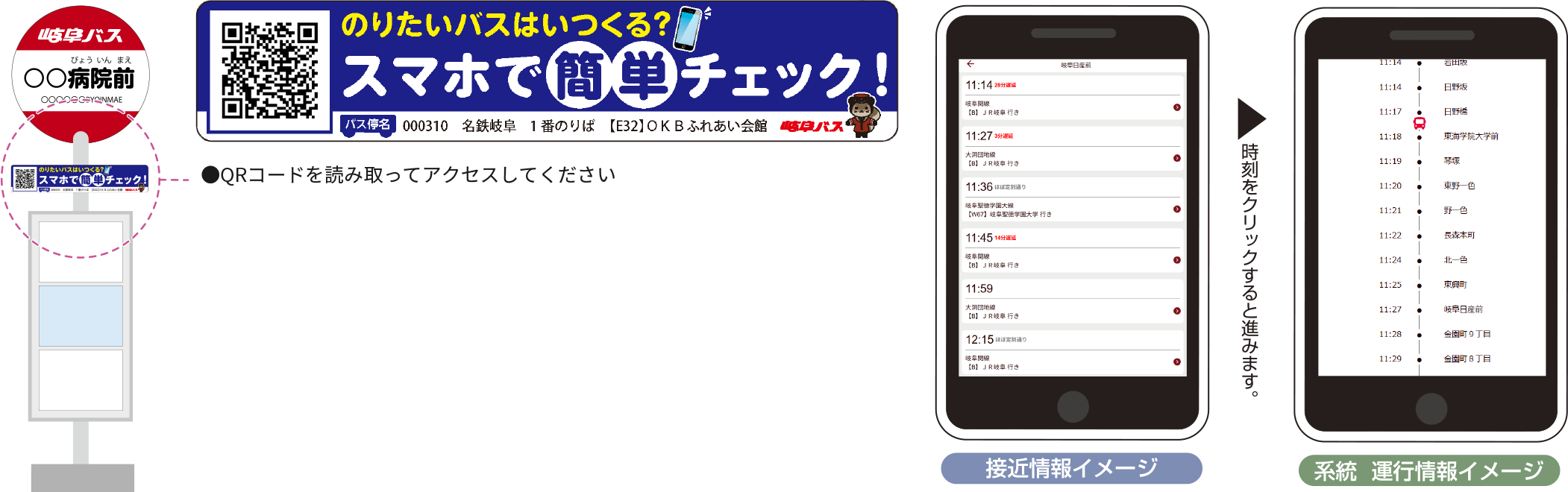 また、携帯電話をお持ちのお客様は、バス停に掲出のQRコードを読み取っていただくことで、バスの発車予定時刻と接近情報をご確認いただけます。